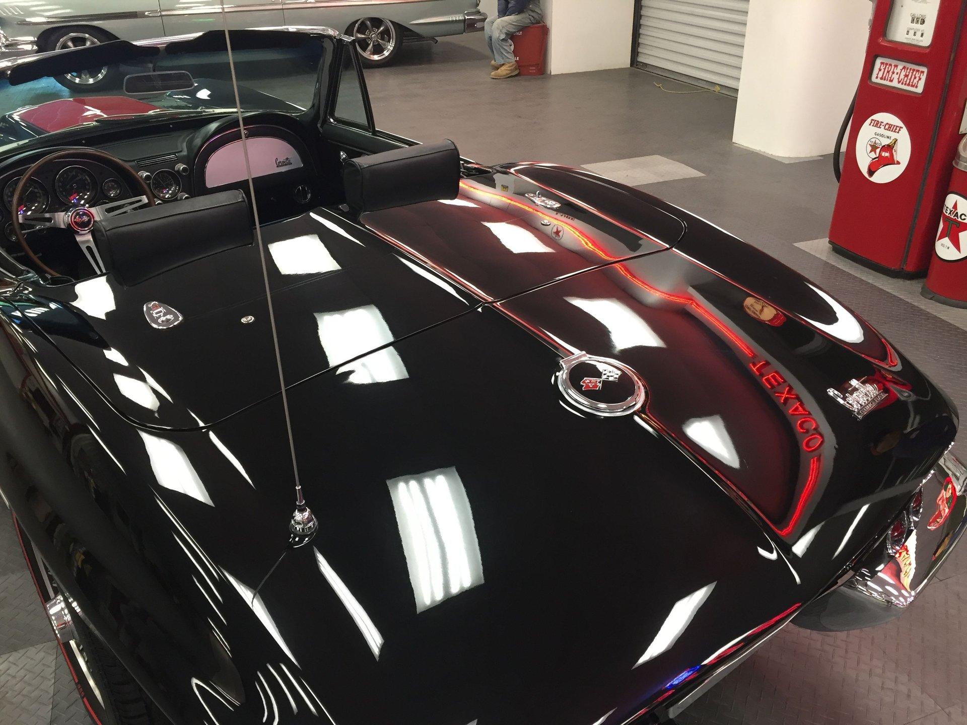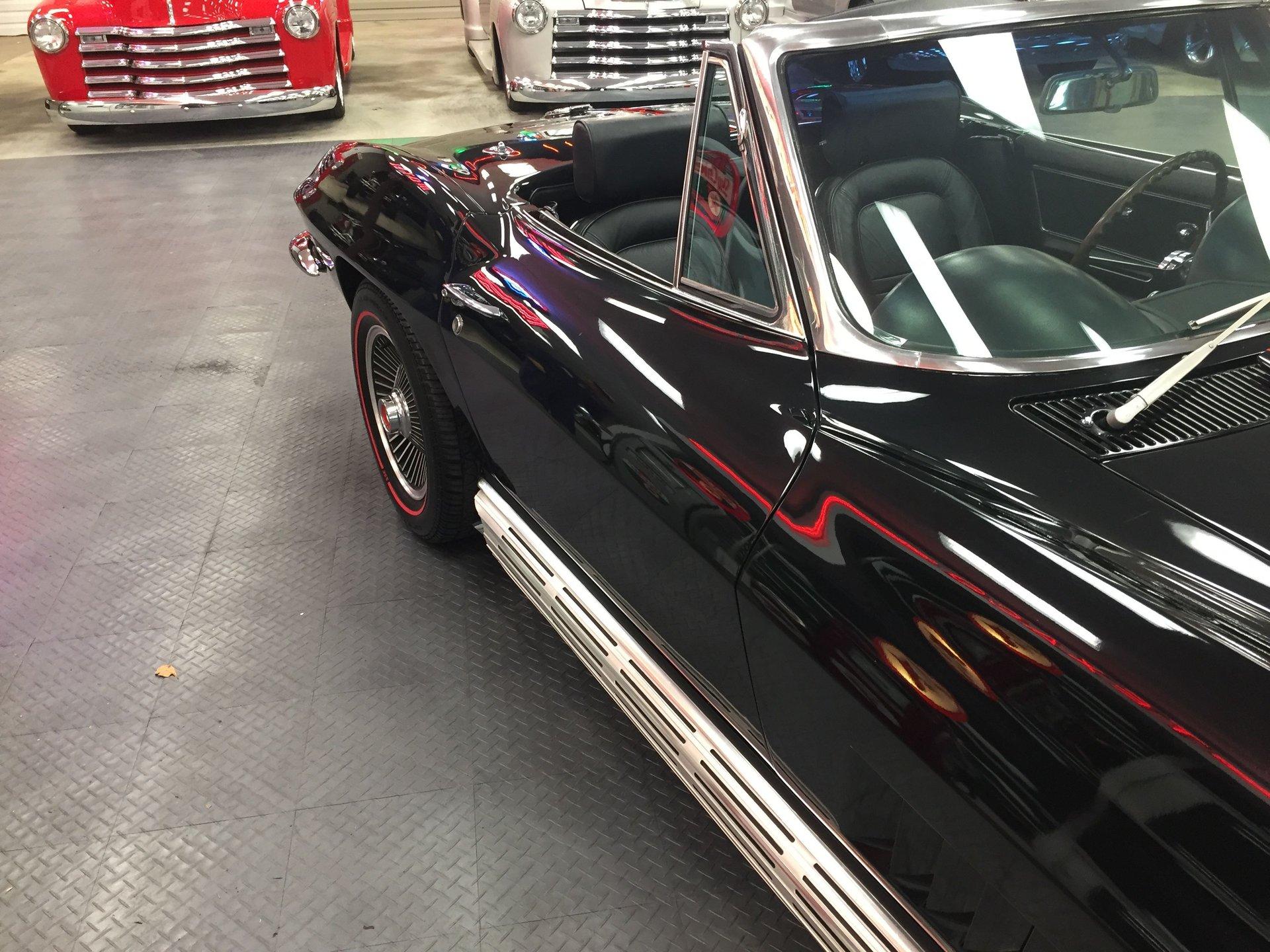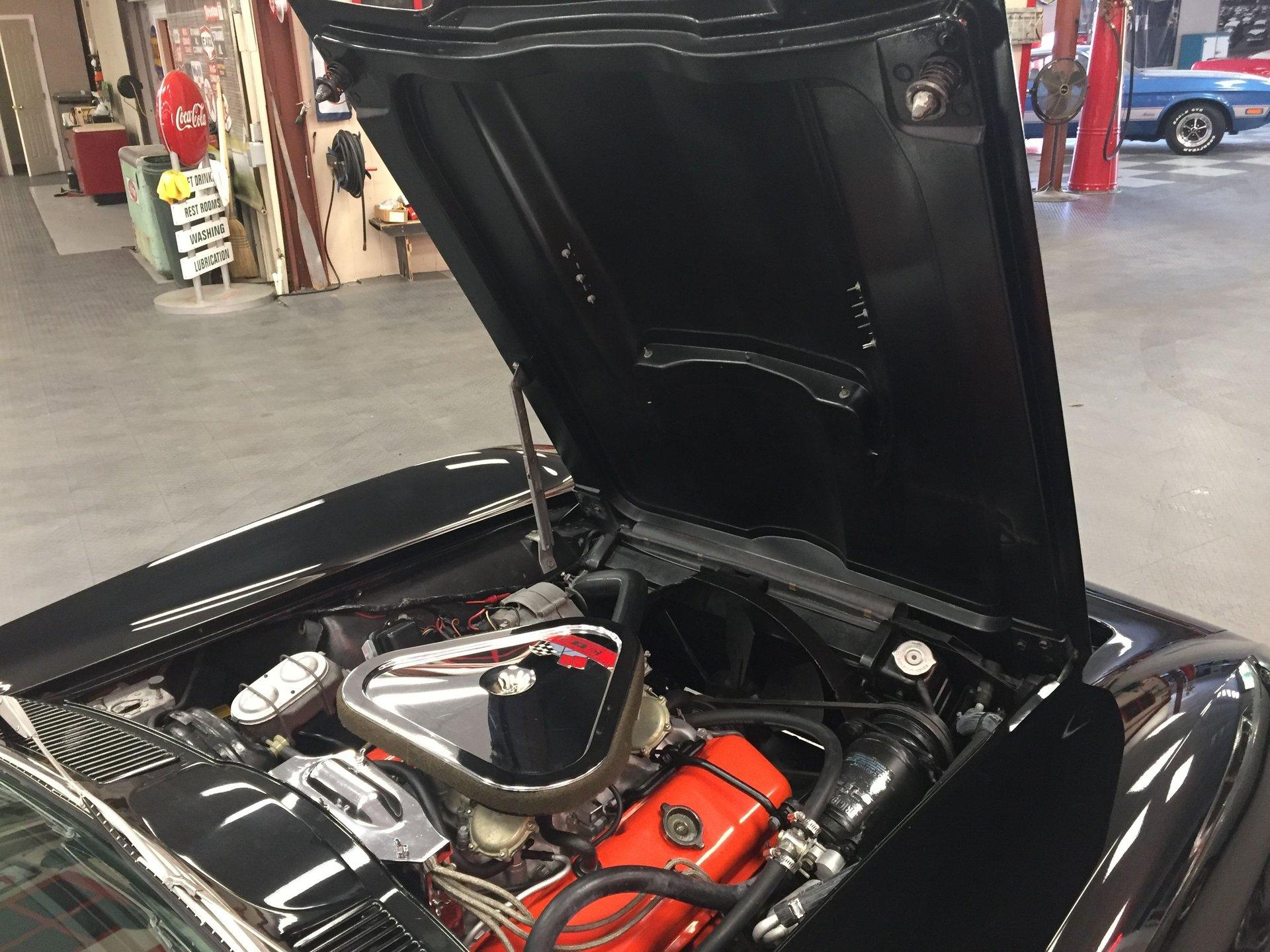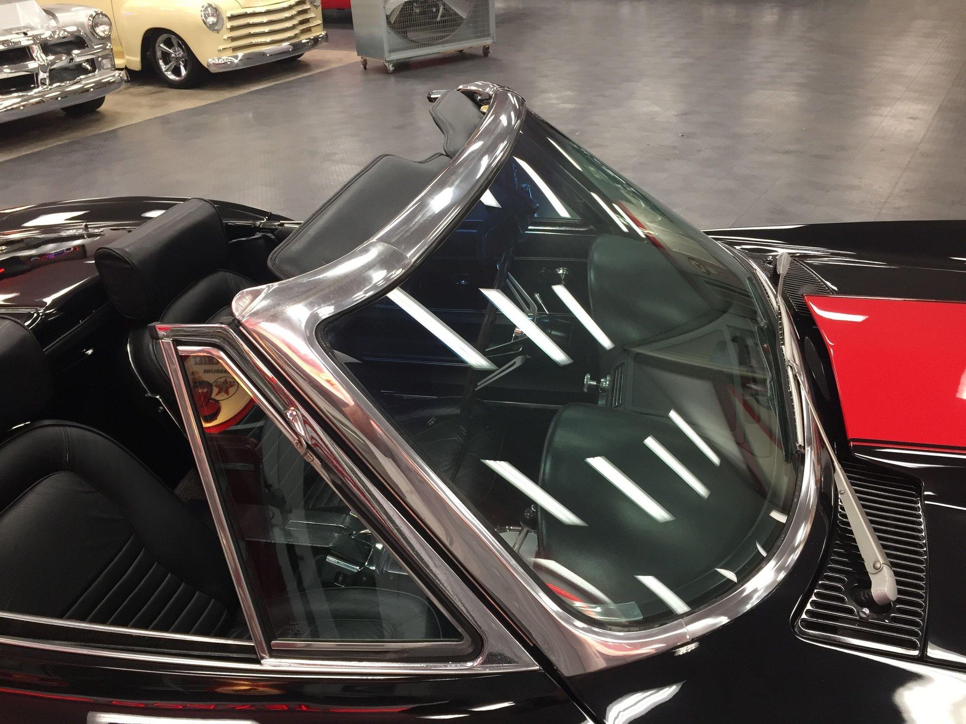 Black leather interior with headrests, telescopic steering wheel, AM-FM stereo, and Red Line tires complete the classic look. Arrow-straight body, superb fit and finish, and a high-gloss black paint make this Corvette stand out.