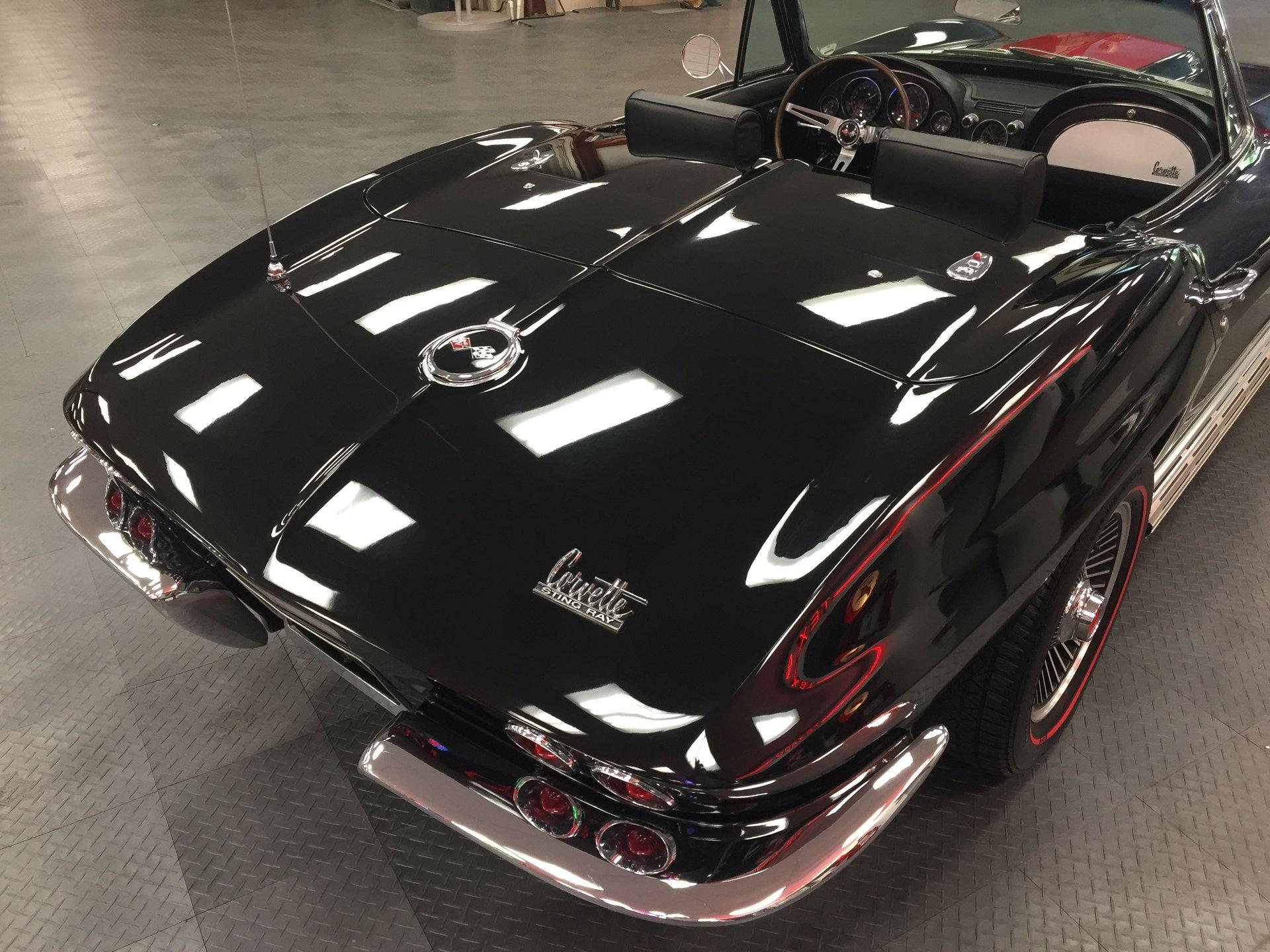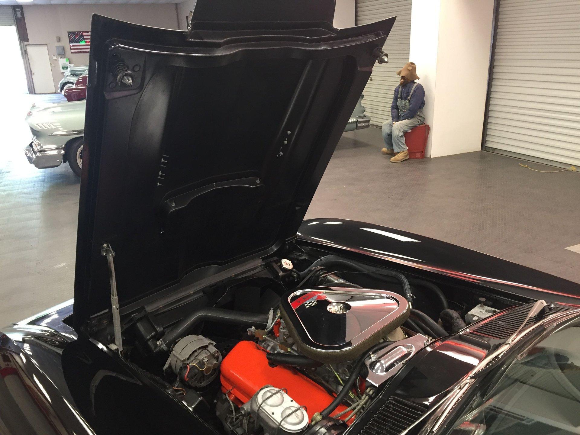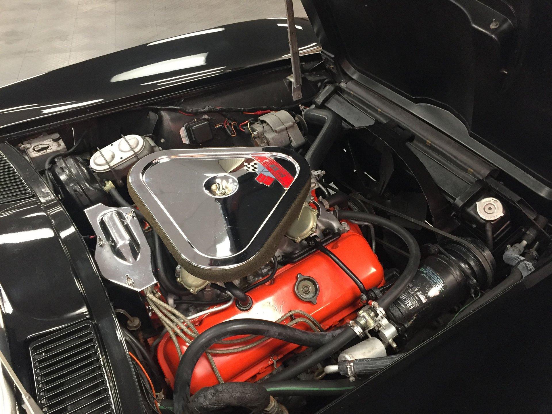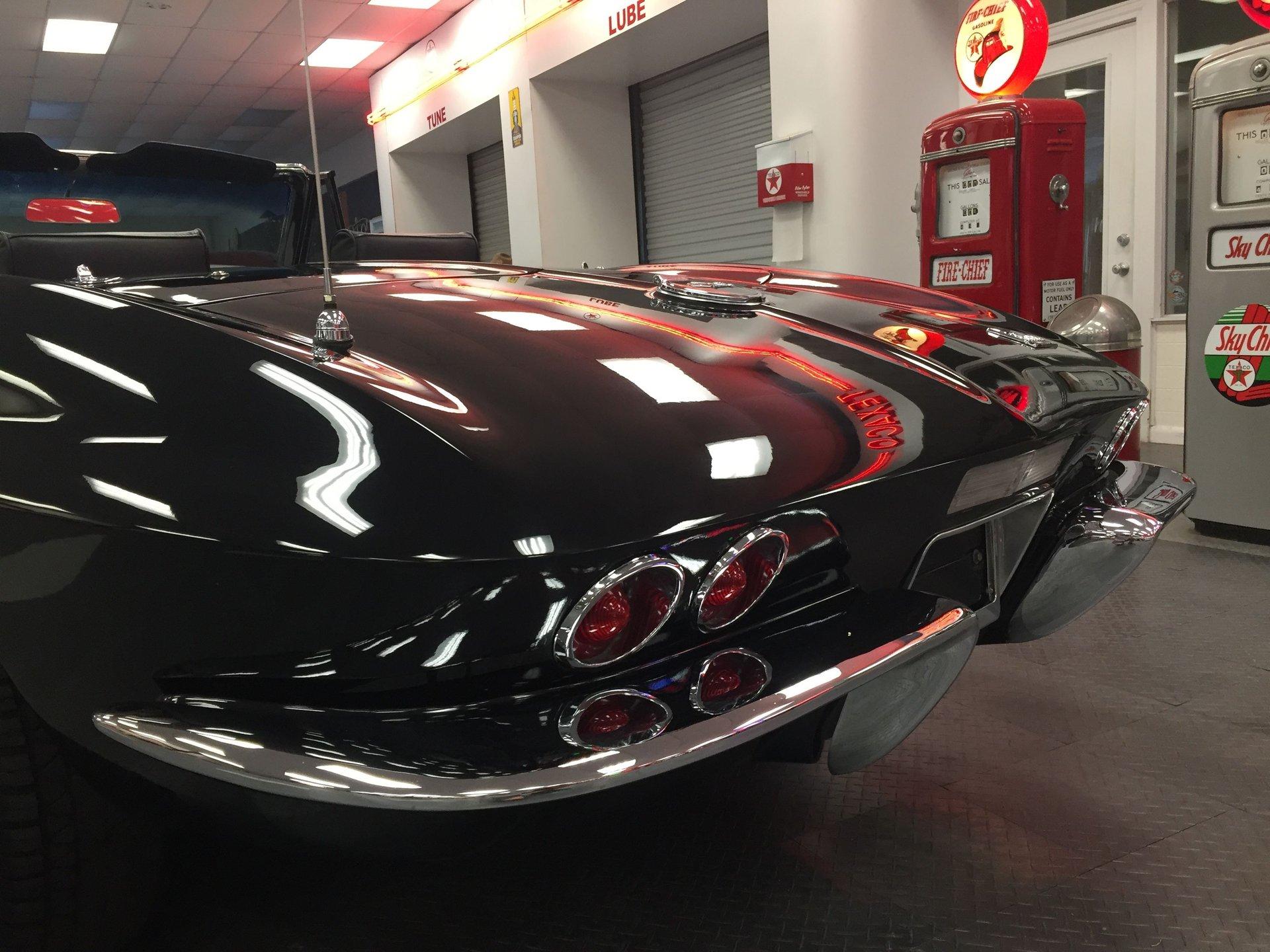 Black leather interior with headrests, telescopic steering wheel, AM-FM stereo, and Red Line tires complete the classic look. Arrow-straight body, superb fit and finish, and a high-gloss black paint make this Corvette stand out.