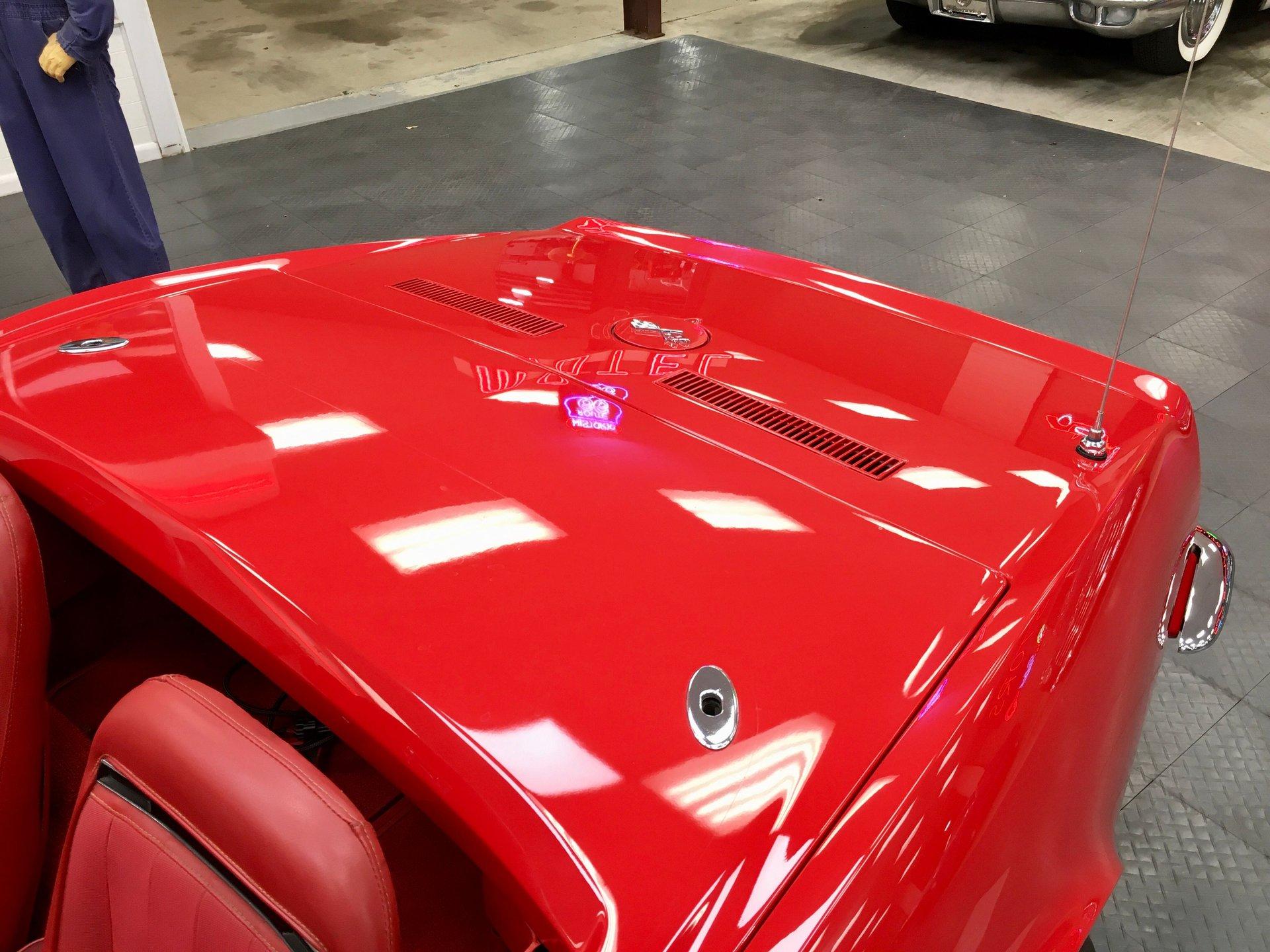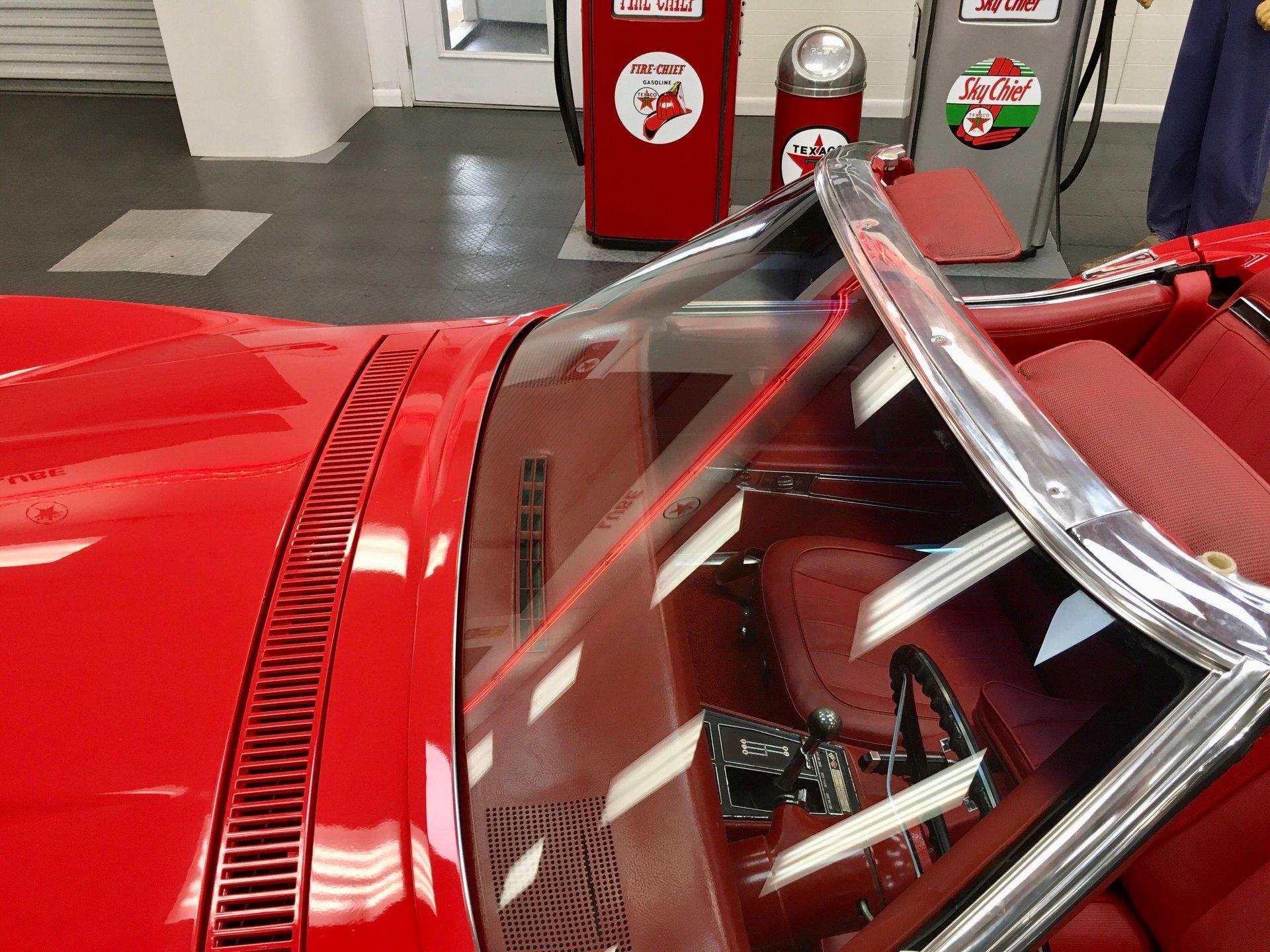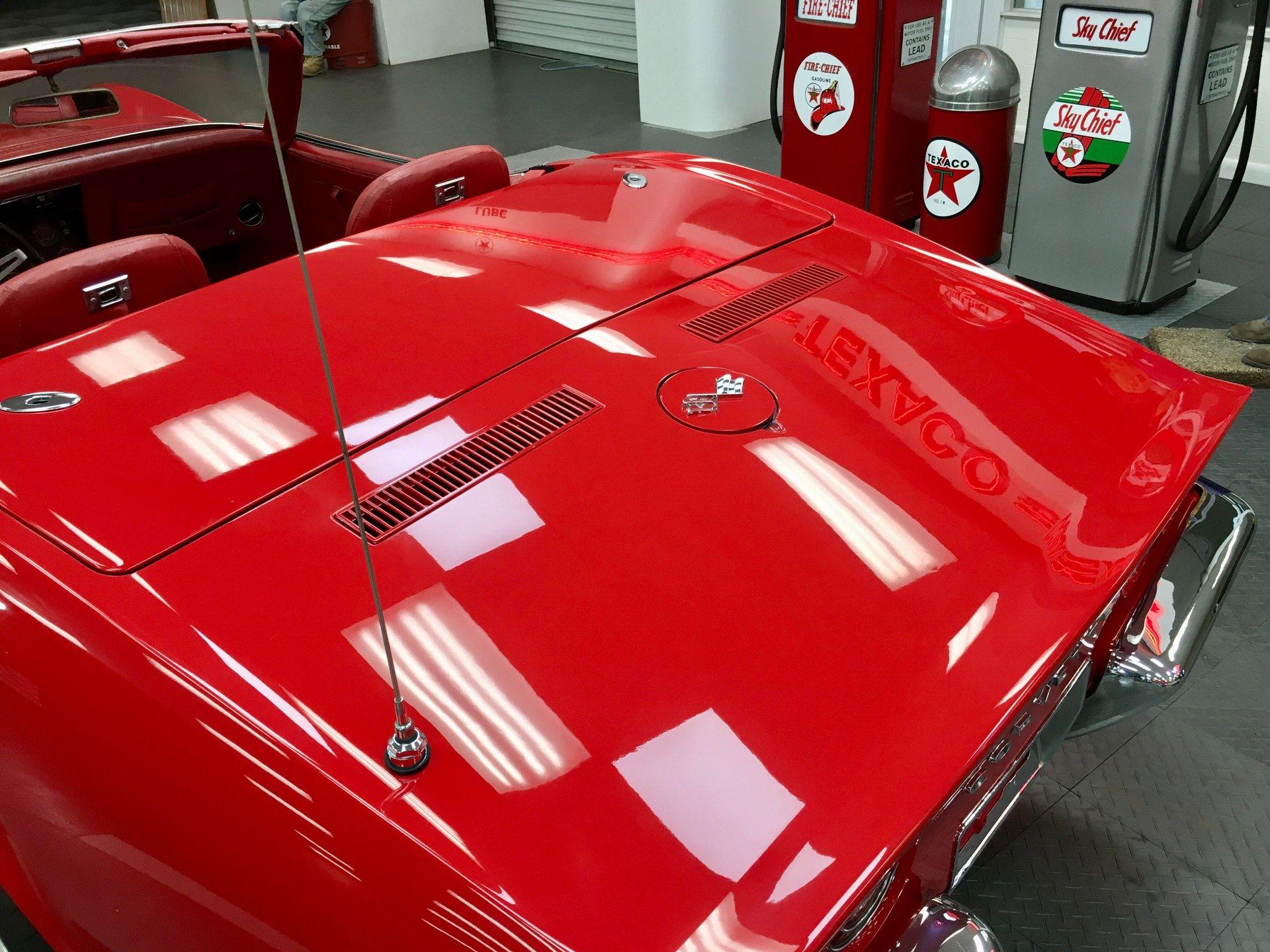The body is remarkably straight with a deep, glossy two-stage red finish that shows beautifully in any lighting. Chrome, stainless trim, glass, and weather stripping are all in excellent condition. The new black convertible top fits tight and clean.